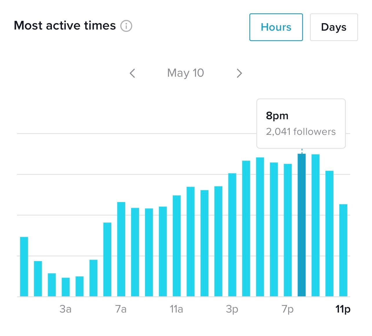 To follow up, in the past week, my followers have most been active during the 3-9 PM hours. While the majority of these days it has been the 8-9 PM range, I still feel it's better to upload earlier in the evening since the activity rate takes a steep decline after those hours. To my knowledge I can't go back further than a week, but I'd presume my followers are usually most active during those same hours.